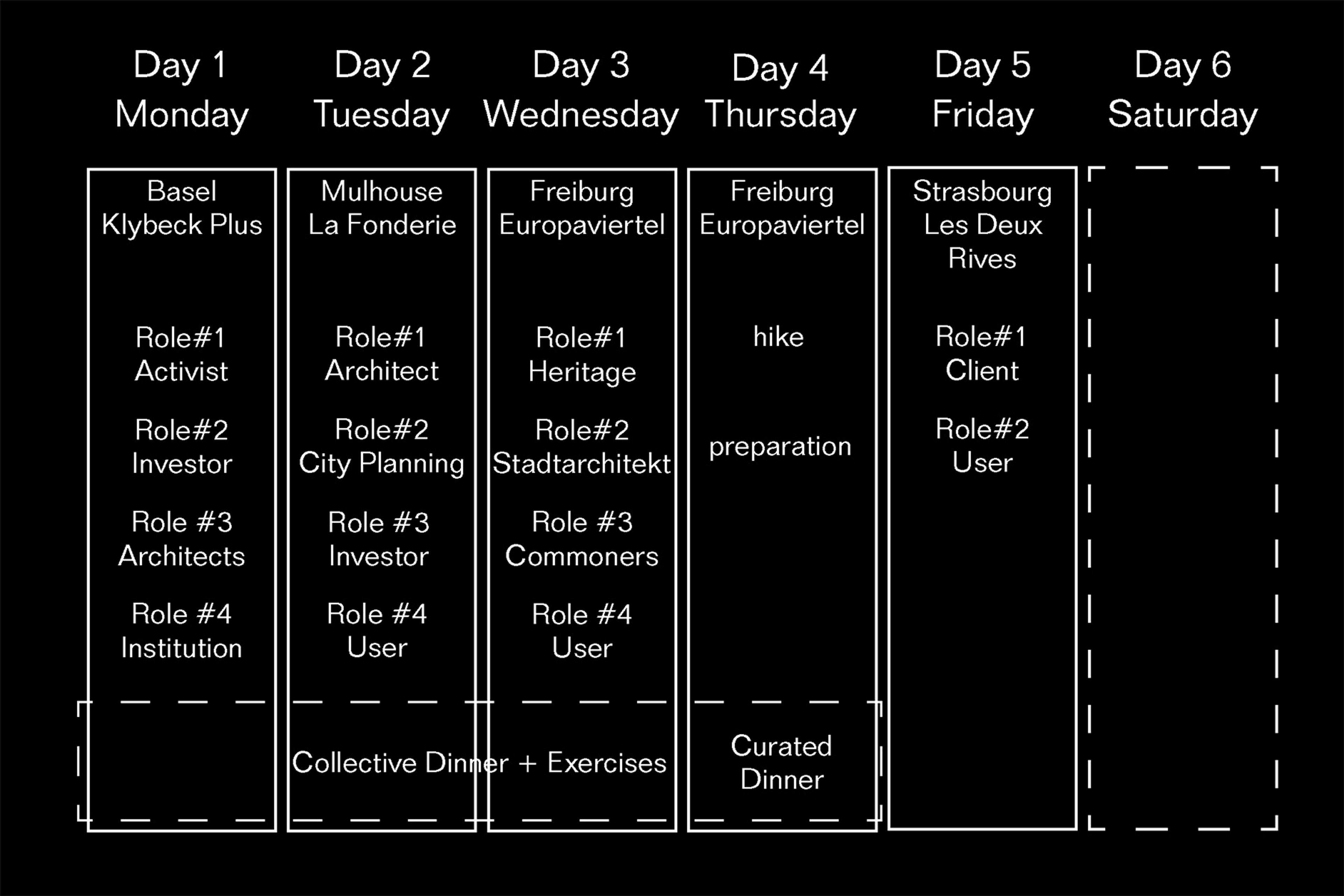 During the evenings we collectively shared our meals in order to digest the impressions collected. These evenings were also test situations to design informal exchange. Our trip culminated in a performative dinner with local stakeholders in Freiburg, tackling the transformation process of the “Europaviertel” – a moment that both, generously invited and critically challenged everyone involved.